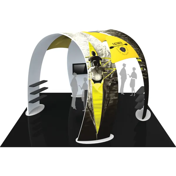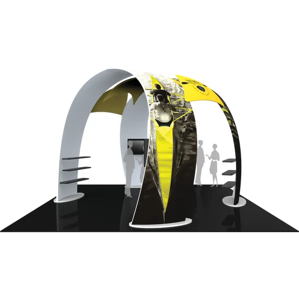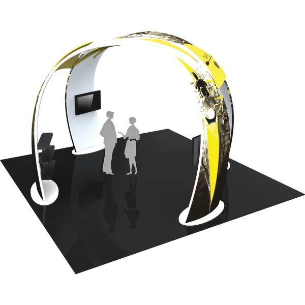 This organically-shaped, eye-catching structure allows for ample floor space for traffic flow, product demonstrations and engaging meetings. The 12.5′ tall, 16′ wide curved fabric arches provide areas within the space for shelving to display merchandise and products, as well as two areas for TVs to display digital media. One centrally-located fabric structure sits slightly underneath and in the middle of the two main arches, providing additional real estate for messaging and branding. Two canopy-like accent fabric structures connect the arches and are perfect areas for your company logo. Formulate® Fusion 07 combines five lightweight tubular frame structures with zipper-pillowcase fabric graphics. Display shelves and monitors mounts are included; medium monitor mounts hold 40-50″ TVs up to 50 lbs.